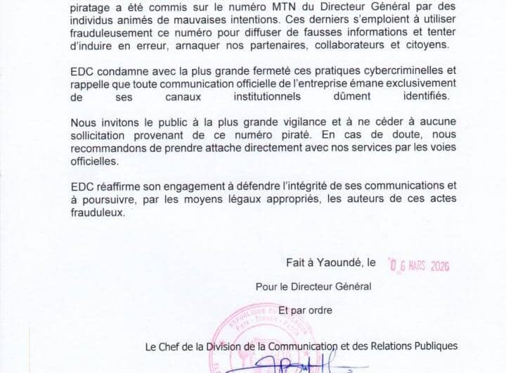 Piratage du numéro du Directeur Général de l’EDC : appel à la vigilanceLa Electricity